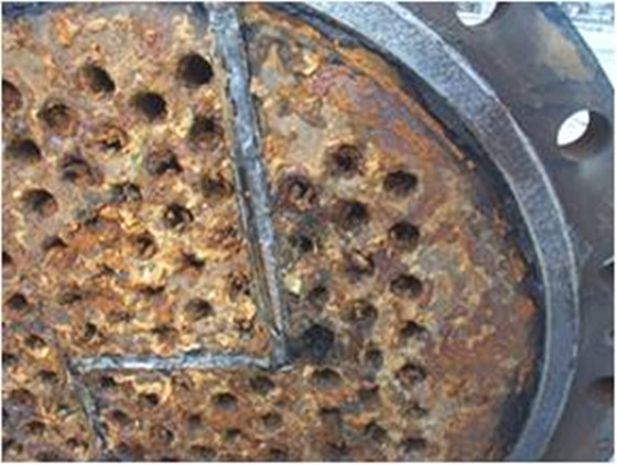 冷凝器腐蝕問題 u 腐蝕形成原因: 腐蝕是指通過化學(xué)或電化學(xué)反應(yīng)使金屬被消耗破壞的現(xiàn)象。冷卻水中的溶解氧與設(shè)備接觸形成腐蝕電池,發(fā)生如下反應(yīng),促使金屬不斷溶解而被腐蝕。 u 腐蝕控制: 向循環(huán)水中投加較低量,適應(yīng)系統(tǒng)水質(zhì)的復(fù)合緩蝕劑,即能使設(shè)備腐蝕控制在標(biāo)準(zhǔn)規(guī)定范圍。對于碳鋼不銹鋼系統(tǒng),優(yōu)選阻垢緩蝕劑配方時,即已復(fù)配入配方中,能解決設(shè)備腐蝕問題,如果系統(tǒng)中有銅設(shè)備,則應(yīng)另添加緩蝕劑,如恒古HG-301系列。 |