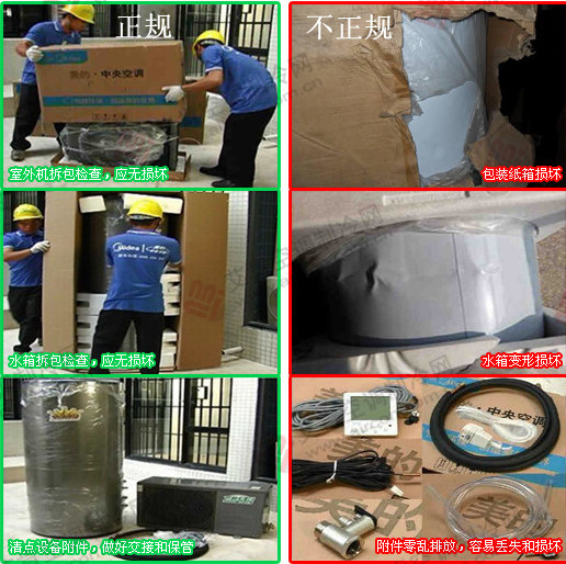 非專業安裝,讓你可能面臨:樓房裝修破壞,無限的高強度噪音,一系列安全隱患……只有通過專業的空調安裝,你的安全才能得到保障,才能真正享受中央空調帶來的舒適感受。 1、拆包檢查